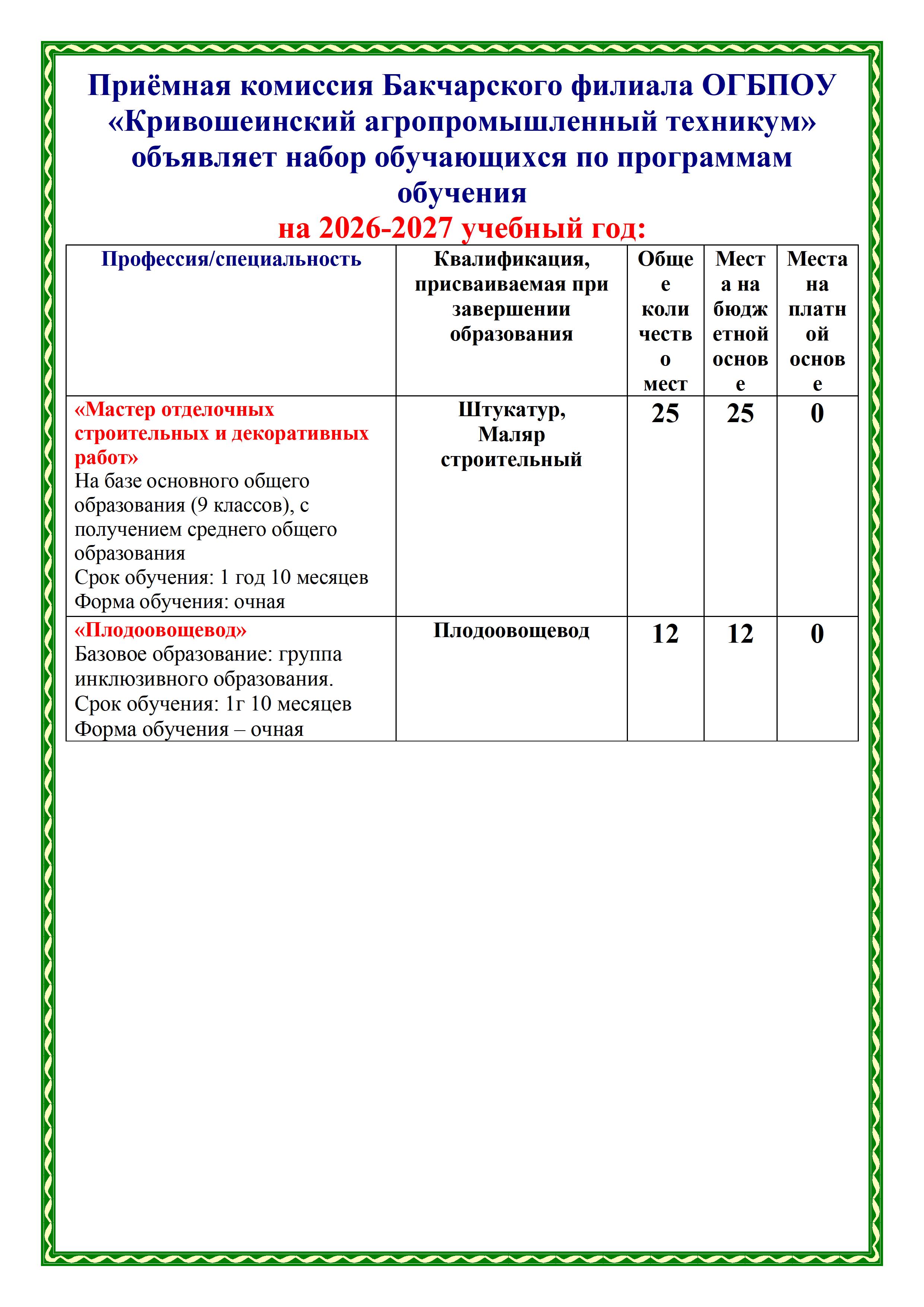 Набор 2026 Бакчар